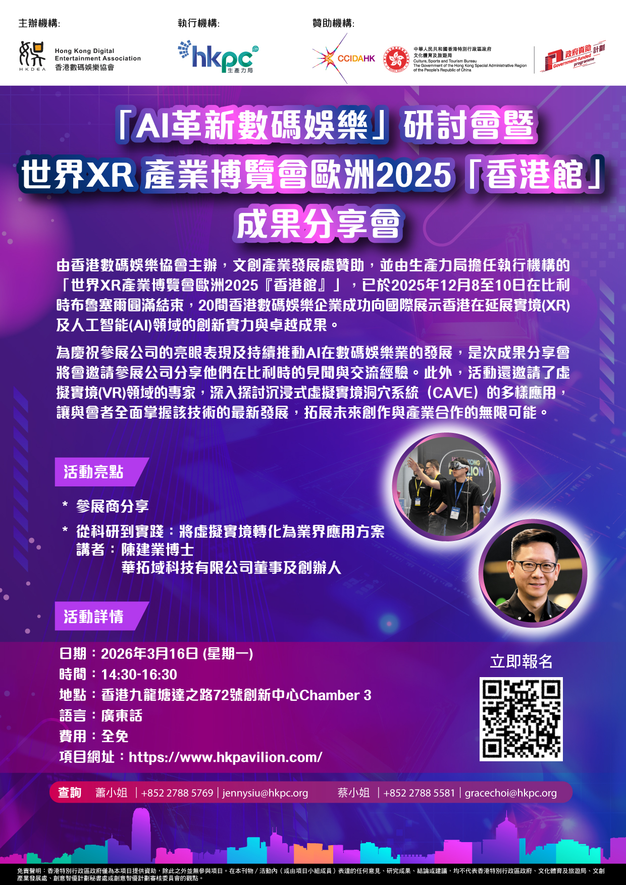 為慶祝參展公司的亮眼表現及持續推動AI 在數碼娛樂業的發展,是次成果分享會將會邀請參展公司分享他們在比利時的見聞與交流經驗。此外,活動還邀請了虛擬實境(VR)領域的專家,深入探討沉浸式虛擬實境洞穴系統(CAVE)的多樣應用,讓與會者全面掌握相關該技術的最新發展,拓展未來創作與產業合作的無限可能。